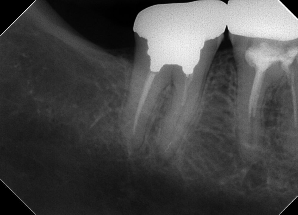 遠心を根管充填した後にレントゲンを撮ったのは、患者様がファイルが残っているのをとても気にされていたので、当初、そのまま根管充填しようと考えたのですが、一応安心していただくために近心根を充填する前に撮影しました。(このまま充填すると取れたのかわからないレントゲンになってしまう)